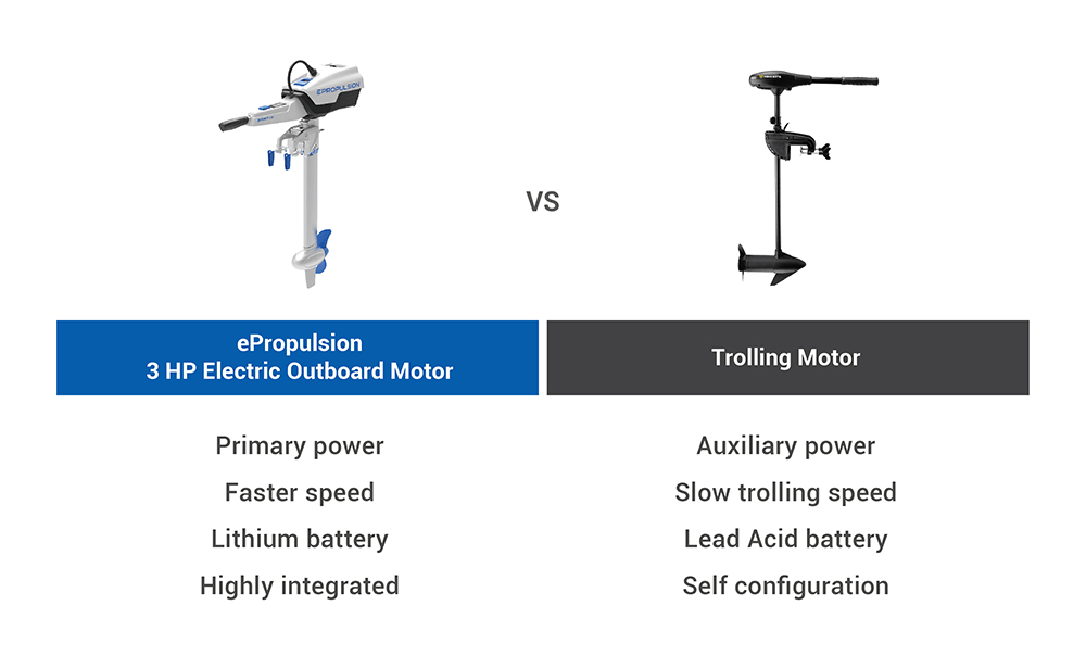Unlike the trolling motors (measured in static thrust) that can only go at slow trolling speed, true electric outboard motors can provide much higher power: They are designed to be used as the primary power source.