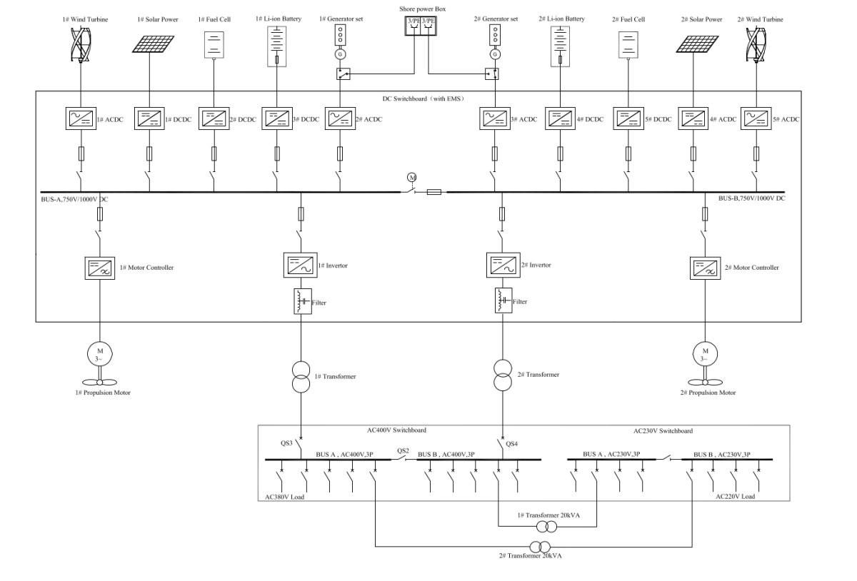 This system allows the vessel to operate as a traditional electric propulsion vessel or as pure electric vessel, or any combination in between.